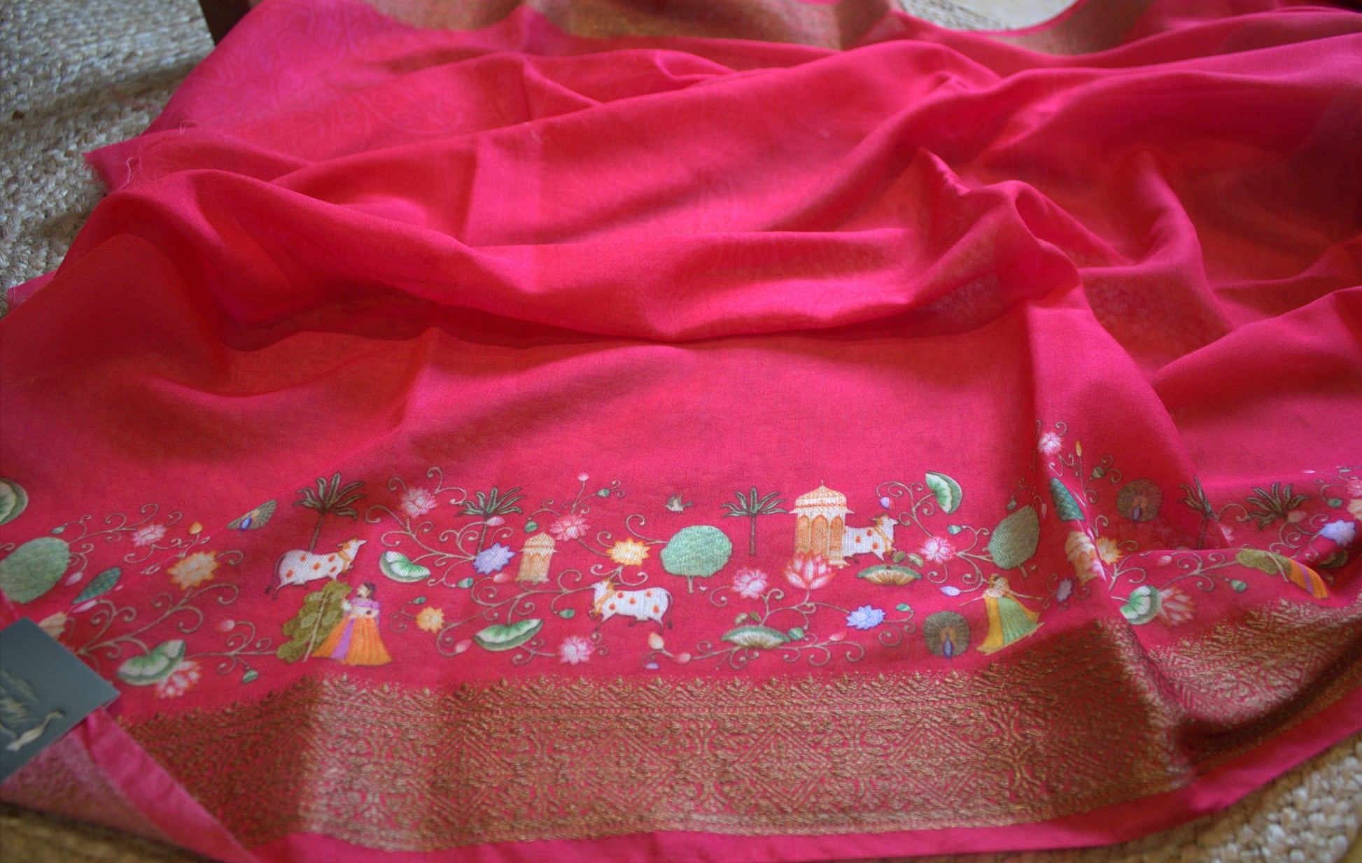 Chanderi Viscose Blue saree with Overall Pichwai print and contrast blouse