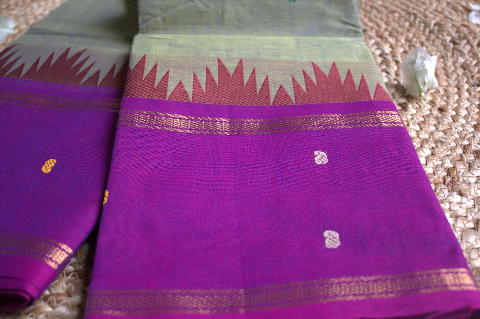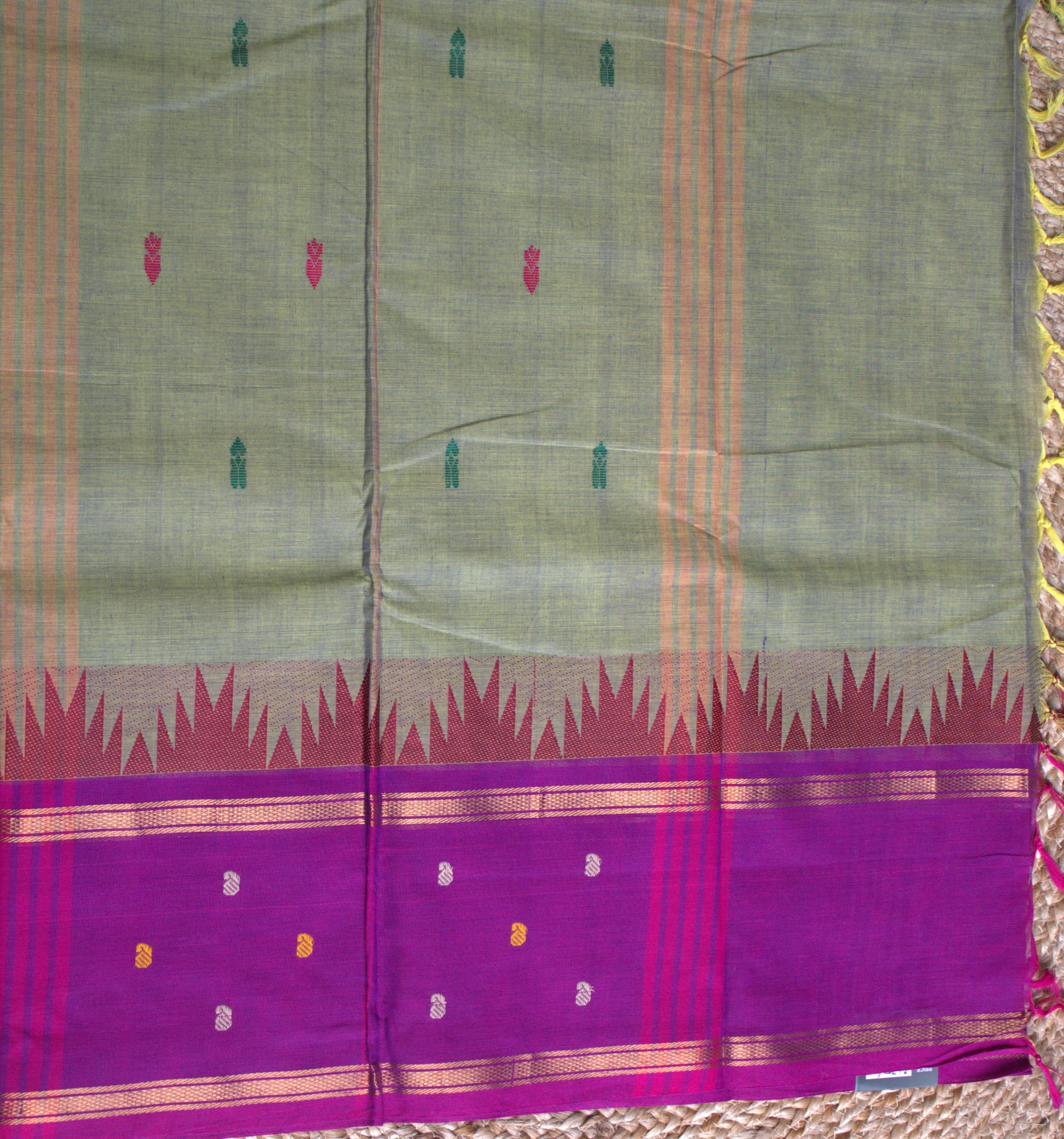 Kanchi cotton Green saree with purple temple border and running blouse