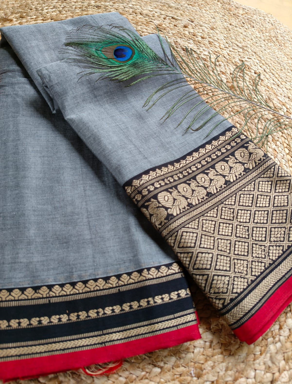 Narayanpet cotton Grey saree with big peacock border and running blouse
