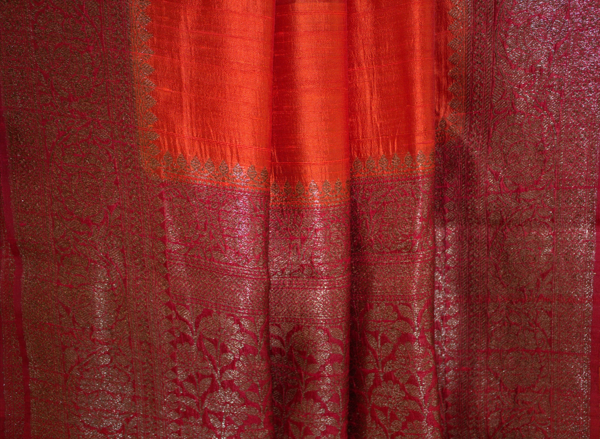 Orange and Red Pure Banarasi Raw Tussar Silk Saree